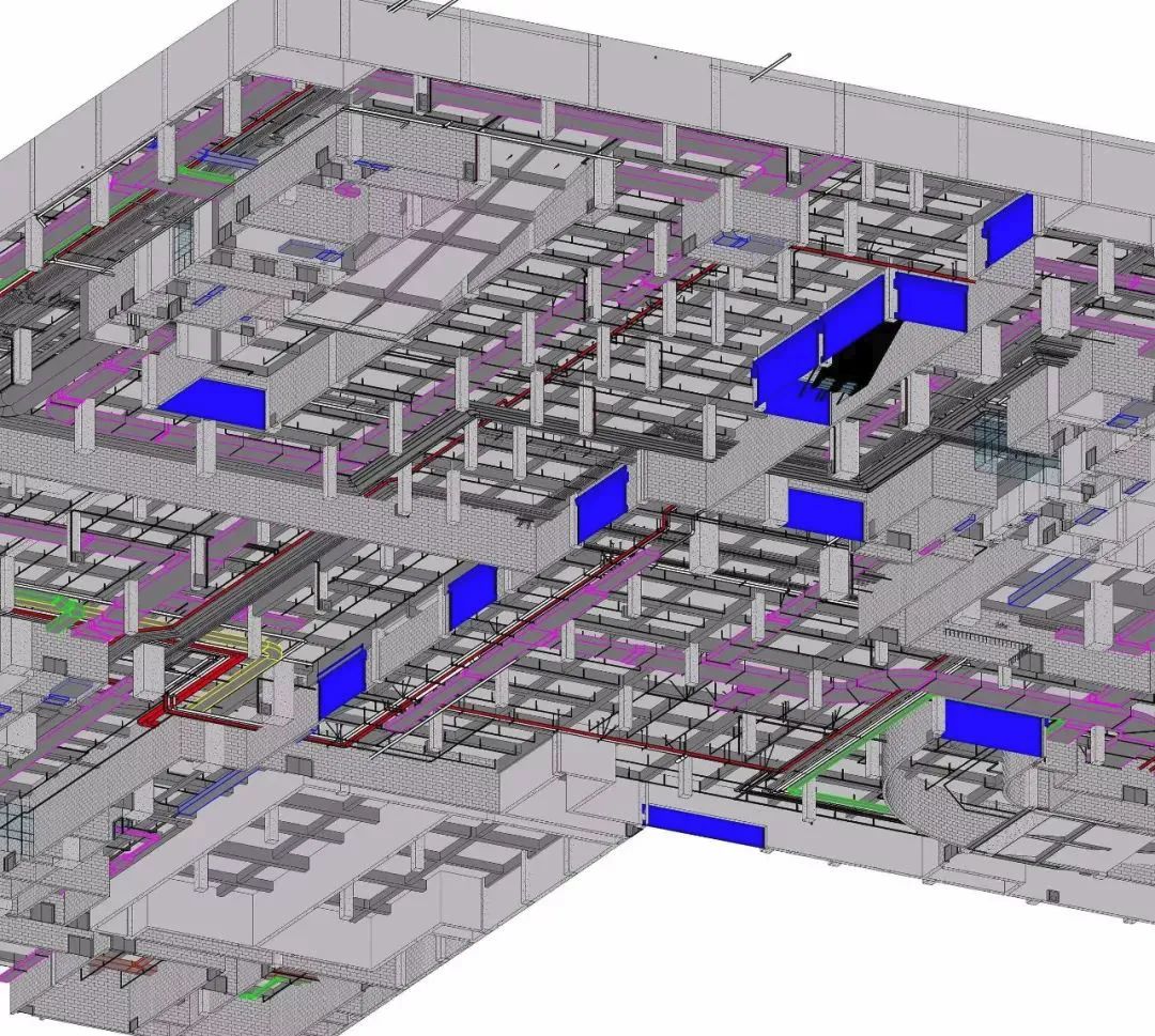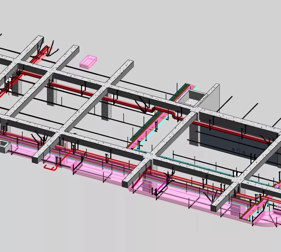 碰撞检测是对建筑BIM模型中的建筑构件、结构构件、机械设备、水暖电管线等进行检查,排查它们之间是否出现交叉、碰撞等无法施工的现象。获取各构件的几何尺寸等其他信息是碰撞检测的必备信息,而目前的CAD等其他设计软件无法做到这一点。在所给的建筑BIM模型中,加入由自动化设计得出的抗震支吊架模型,进行碰撞检测。