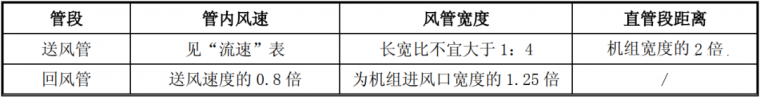 机组进出风口的气流受到风机较大压力的影响会产生强烈的扰力, 与突然改变方向的风管管壁碰撞会产生不稳定的气流影响风机的风量及产生较大的振动和噪音, 破坏了室内环境噪音要求, 送回风管设计应满足下表要求:
