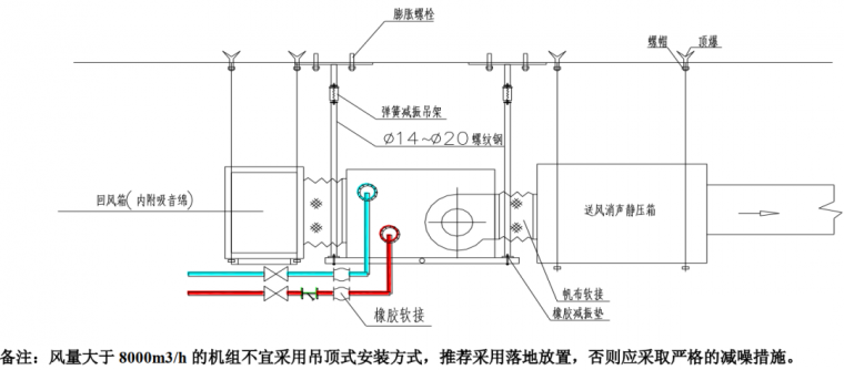3) 风量≥20000m3/h,静压≥350pa 的空调机组宜设空调机房,后制作回风消声箱及消声弯头。