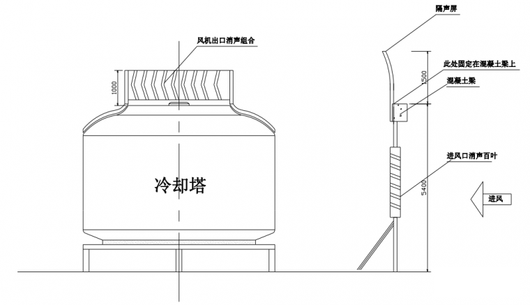 例 某小区投诉商场中央空调冷却塔噪音大,检查发现冷却塔安装在附楼楼顶,离住户只有 10 米,冷却塔风机气流噪音和落水噪音达 65 dB(A);后在冷却塔风机出口制作一个消声导风筒改变气流噪音传递方向, 并在冷却塔和居住楼之间设置一面 2.5m 高的隔声消声百叶墙,上部设隔音屏,改造后噪音满足住户要求。