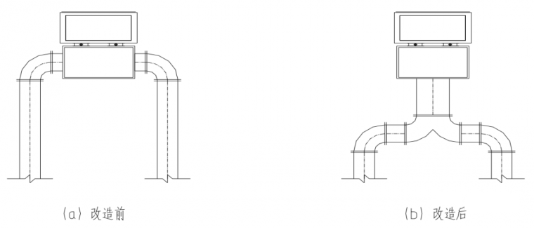 例 某商场用户反应吊顶式空气处理机组连接的消声静压箱振动和噪音均较大,检查发现箱体的侧面直接分出支管(实为接管箱) , 因机组出风口风速大,与近距离的箱壁激烈碰撞导致噪音超标, 后在消声静压箱后做 2m 的直管段风管再做三通分路, 箱体的振动和碰撞噪音明显降低。
