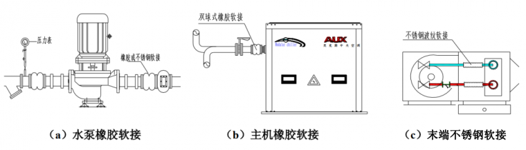 例 某工程水泵安装运行时水管段振动严重, 导致靠近主管房间产生噪音, 检查发现水泵进出水口的橡胶软接未装, 水泵运行时的振动通过管道传入室内,后补装橡胶软接噪音减小。