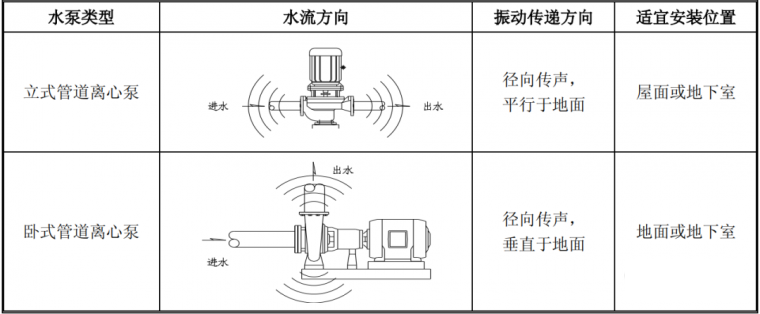 水泵振动噪音主要由电动机机械噪音、叶轮振动、水流噪音和气蚀噪音形成的, 不同形式水泵振动传递方式不一样,应根据现场实际情况选择相应的水泵,对于水泵不同噪音采取相应的措施,下为空调常用水泵形式及适宜安装场所: