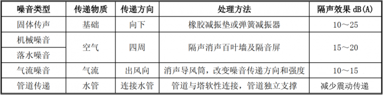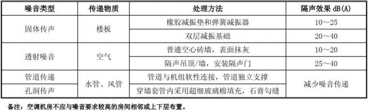空调机房的噪音源为空调风机机械性振动和气流噪音,但机房内噪音经过墙体和楼板的多次反射形成混响声, 多种噪音相互叠加比相同声源在室外的噪音高出 20 dB(A), 空调机房应采取相应的减噪措施, 下表为机房不同类型噪音及处理方法: