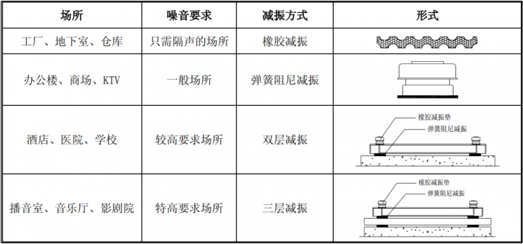 空调主机振动主要产生振动传递和固体传声,放置于屋顶的主机会导致楼板的低频二次结构噪音,其穿透力较强,对人员的休息和工作造成不同程度的影响,不同场所的减振应按下表方法执行: