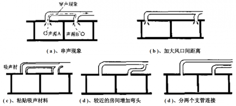 同一个风管系统相邻房间因风管距离短、管件衰减不够或风管内噪音吸收不够存在串音的现象, 尤其是空调不送风时尤为严重,以下为几种常用串音处理方法:
