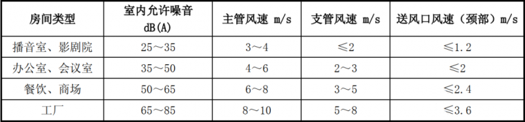 气流噪音是由风道内气流流速和压力的变化以及对管壁和障碍物的作用而引起的,过高的风速极易引起气流噪音, 不同噪音要求场所风速设计应符合下表要求: