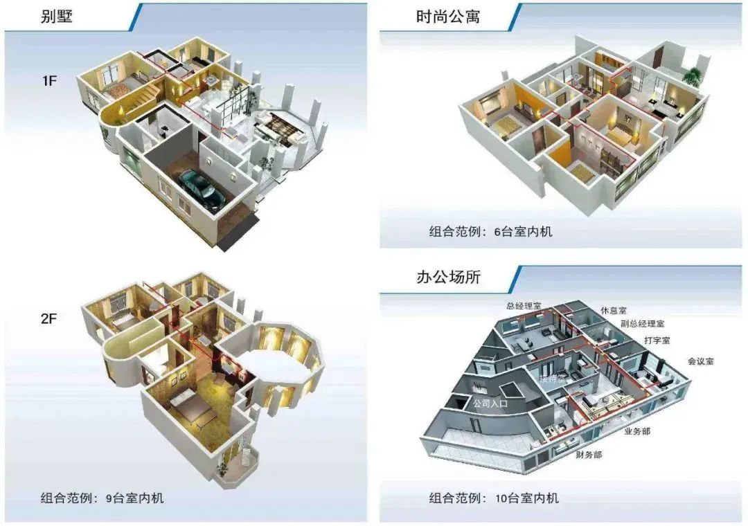 不同功能的房间对噪音的要求不尽相同, 应根据具体噪音要求选择合适的室内机型, 以下为典型场所的室内机型形式: