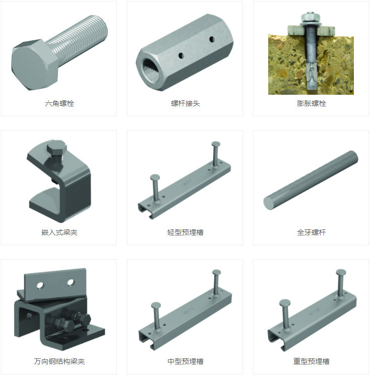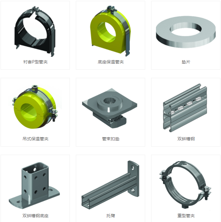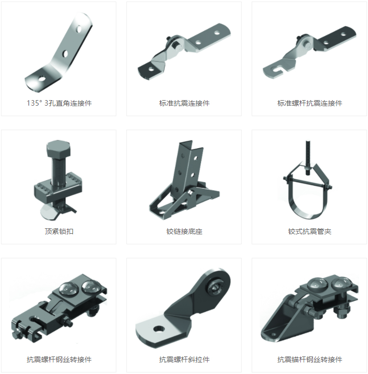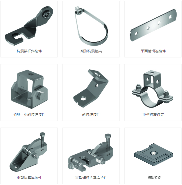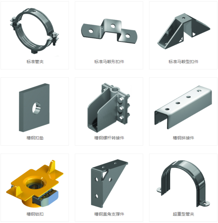 1、材质:市场上一般采用的是Q235B,主要有冷镀锌(电镀)、热浸镀锌。冷镀锌:镀锌层厚度比较薄;热镀锌:镀锌层厚度比较厚点。目前支架较多采用的是热浸镀锌(镀锌层厚度一般在70~80μm),配件配件采用电镀(镀锌层一般在5μm)。还有些厂家支架采用其它材料的,如:锌铝镁型材。2、组成构建:抗震支吊架系统:由锚固体、加固吊杆、抗震连接构件、抗震斜撑组成。3、材料配件:全螺纹吊杆、膨胀锚栓、C型槽钢/CB型槽钢、六角连接器、管夹、U型管吊架、P型管夹、Ω型夹、加劲装置、可调试铰链、抗震连接座、槽钢螺母(带弹簧)、U型压块、盖板、普通螺母、平垫圈、全牙螺栓、限位组件、塑料端盖等,还需要金属喷锌剂。
