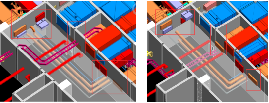 运用BIM技术,对错综复杂的管线进行碰撞检查,如图所示,对有影响的地方进行合理调整,避免工程返工,造成预制生产材料的浪费。