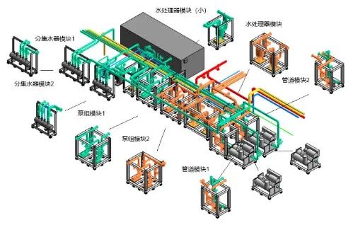 冷水机房模块化拆分将整体拆分为泵组模块、全程水处理器模块、冷水机组管道模块、分集水器模块等8个模块,BIM模型及模块化拆分如图所示。