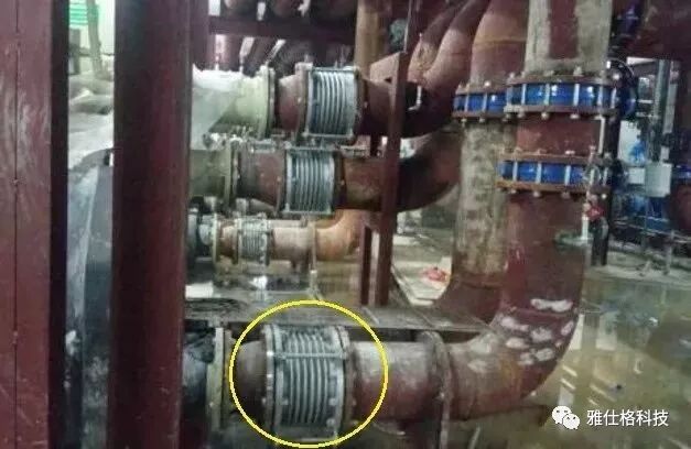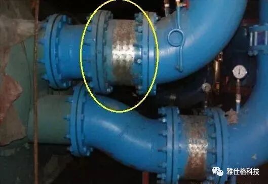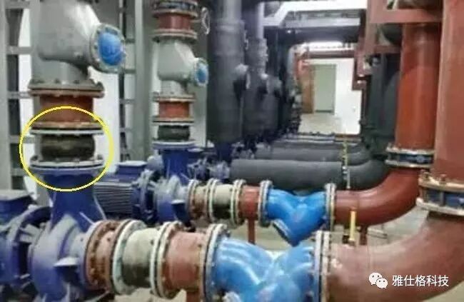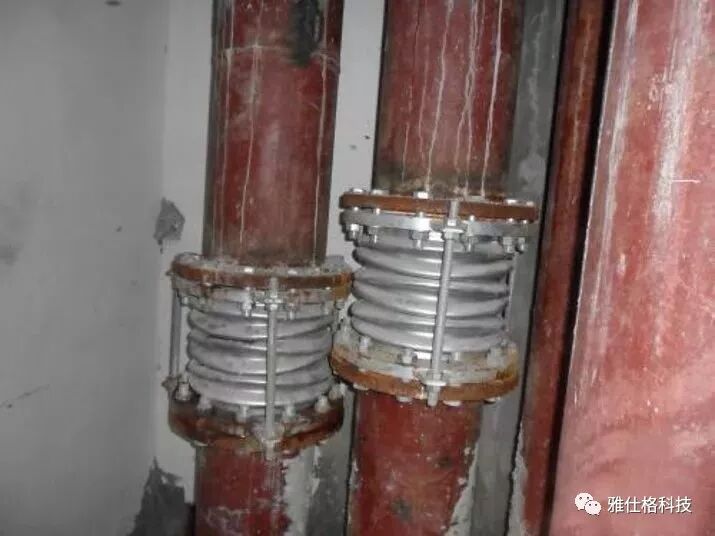 2. 水泵、冷水机组、风机盘管、空调机组等机电设备与水管之间用软管连接,不使振动传递给管路。软管有两类:橡胶软接管和不锈钢波纹管。橡胶软接管隔振减噪的效果很好,缺点是不能耐高温和高压,耐腐蚀性也差。在空调与采暖的水系统中多用橡胶接管。不锈钢波纹管能耐高温、高压和耐腐蚀,但价格较贵,一般用于制冷剂管路的隔振。
