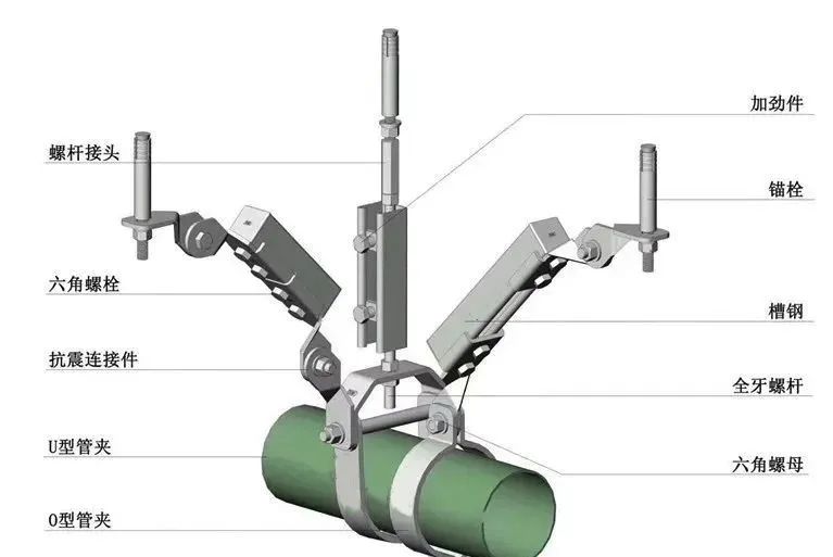 抗震支架应和结构主体可靠连接根据项目所在地的抗震设防烈度,以地震力为主要荷载,由锚固件、加固吊杆、抗震连接构件及抗震斜撑组成。抗震支吊架的所有构件应采用成品构件,连接紧固件的构造应便于安装。